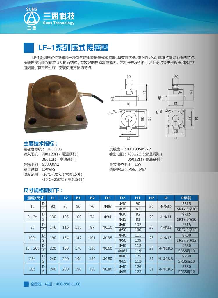 產(chǎn)品詳情 功能介紹 產(chǎn)品優(yōu)勢(shì) 參數(shù)/型號(hào) 包裝清單 產(chǎn)品詳情 LF-1系列壓式傳感器是一種新的防水改進(jìn)壓式傳感器,具有高度低、密封性能優(yōu)、抗偏抗側(cè)能力強(qiáng)的特點(diǎn)。承載連接采用銅球或SR球面結(jié)構(gòu),有較好的自動(dòng)復(fù)位能力。常用于電子臺(tái)秤、地上衡稱(chēng)等電子儀器和各種力值測(cè)量,有互換性好、安裝使用方便的特點(diǎn)。 功能介紹 產(chǎn)品優(yōu)勢(shì) 參數(shù)/型號(hào) 包裝清單