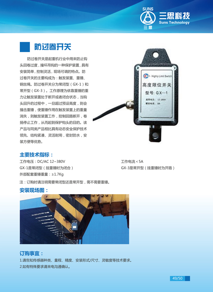 防過卷開關(guān)是起重機行業(yè)中用來防止鉤頭回卷過度,撞壞吊鉤的一種保護裝置,具有安裝簡單、控制靈活、現(xiàn)場可調(diào)的特點。防過卷開關(guān)的主要構(gòu)成為:觸發(fā)裝置、重錘、鋼絲繩。防過卷開關(guān)分為常閉型 (GX-1)和常開型(GX-3)。工作原理為依靠重錘的重力讓觸發(fā)裝置處于斷開或者閉合狀態(tài) ,當(dāng)鉤頭回升的過程中,一旦超過預(yù)設(shè)高度,則會撞擊重錘,使重錘作用在觸發(fā)裝置上的重量消失,則觸發(fā)裝置工作,控制回路斷開,卷揚停止工作,從而起到保護鉤頭的目的。該產(chǎn)品與同類產(chǎn)品相比具有動態(tài)安全保護技術(shù)領(lǐng)先、結(jié)構(gòu)緊湊、靈活耐用、密封防水,安裝方便等優(yōu)勢。