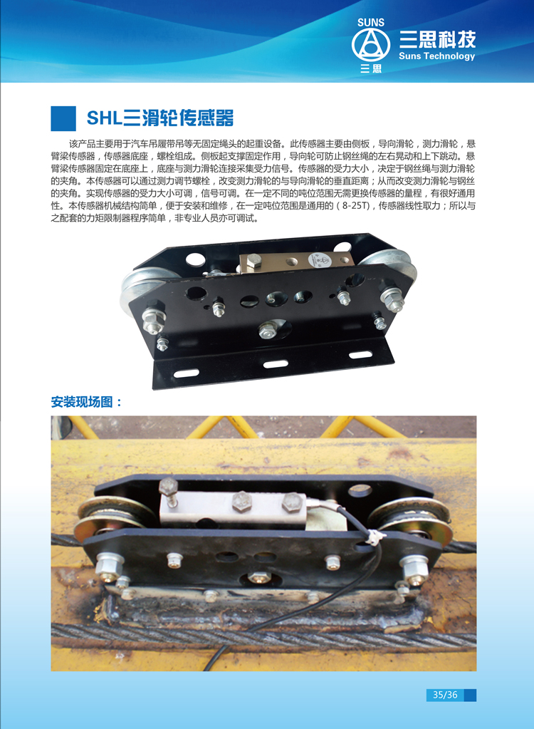 該產(chǎn)品主要用于汽車吊、履帶吊等無固定繩頭的起重設(shè)備。此傳感器主要由側(cè)板、導(dǎo)向滑輪、測力滑輪、懸臂粱傳感器、傳感器底座 ,螺栓組成。側(cè)板起支撐固定作用,導(dǎo)向輪可防止鋼絲繩的左右晃動和上下跳動。懸臂粱傳感器固定在底座上,底座與測力滑輪連接采集受力信號。傳感器的受力大小,決定于鋼絲繩與測力滑輪的夾角。本傳感器可以通過測力調(diào)節(jié)螺栓,改變測力滑輪的與導(dǎo)向滑輪的垂直距離,從而改變測力滑輪與鋼絲的夾角,實現(xiàn)傳感器的受力大小可調(diào)、信號可調(diào)。在一定不同的噸位范圍無需更換傳感器的量程,有很好通用性。本傳感器機(jī)械結(jié)構(gòu)簡單 ,便于安裝和維修,在一定噸位范圍是通用的(8-25T),傳感器線性取力,所以與之配套的力矩限制器程序簡單,非專業(yè)人員亦可調(diào)試。