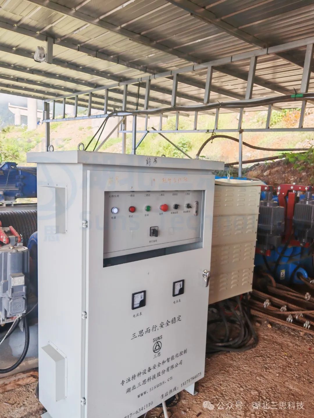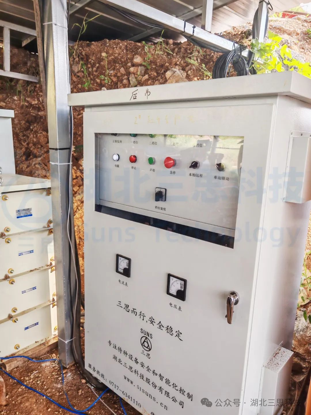 ▲電氣柜安裝完工展示。電氣柜中安裝有PLC,電氣柜上安裝啟動停止按鈕,并且安裝電壓表以及電流表方便集中控制。