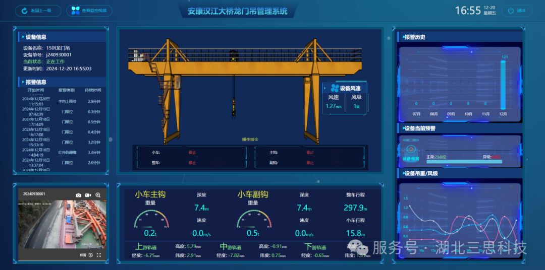 由湖北三思科技自主研發(fā)的纜索吊集中智能控制系統(tǒng)正式亮相本次載荷試驗(yàn)。本系統(tǒng)對主承重索、牽引索、纜風(fēng)索、扣索、背索等索力及起重拉力、塔偏、錨碇與錨梁位移、卷揚(yáng)機(jī)溫度等進(jìn)行實(shí)時監(jiān)測,將視頻與數(shù)據(jù)平臺結(jié)合,直面施工現(xiàn)場卷揚(yáng)機(jī)工作情況,真實(shí)反映吊裝過程中受力情況及塔偏,有異常情況系統(tǒng)會自動報警,保證纜索吊系統(tǒng)的安全穩(wěn)定性,為整個吊裝過程提供安全強(qiáng)有力保證。