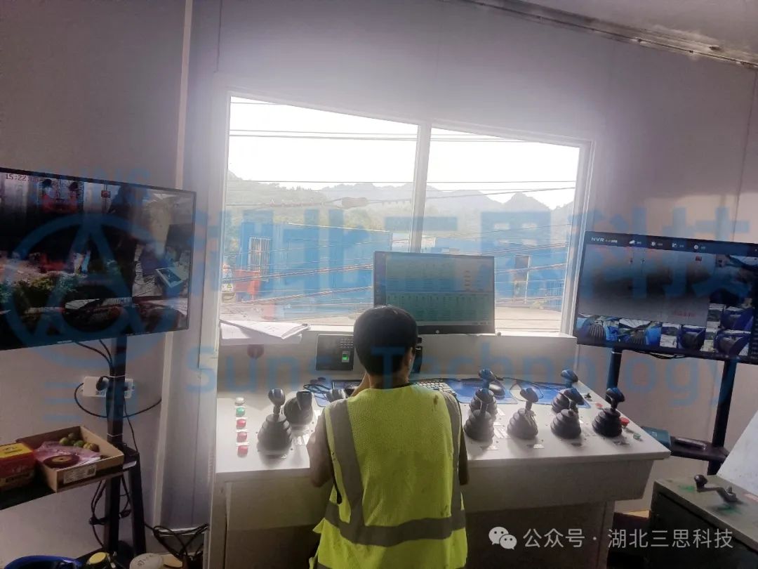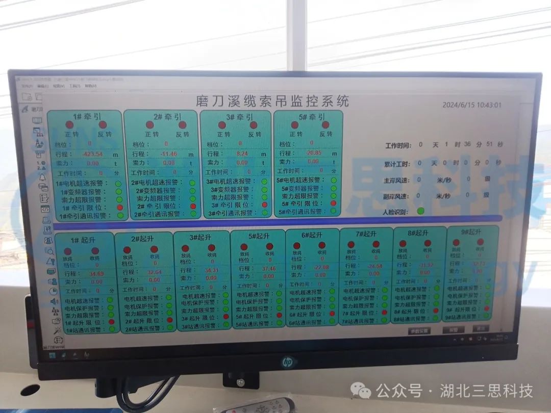 該橋江口、龍缸兩岸拱座均背靠在陡峭的山體,垂直于磨刀溪河施工現(xiàn)場(chǎng),有滑坡危巖、巖石裂隙發(fā)育,現(xiàn)場(chǎng)施工場(chǎng)地狹小、危險(xiǎn)系數(shù)高、施工難度大。因此,本項(xiàng)目纜索吊機(jī)采用了由湖北三思科技自主研發(fā)的纜索吊機(jī)集中控制管理系統(tǒng),使設(shè)備的操作方式由傳統(tǒng)的“一人控制一機(jī)”升級(jí)為“一人控制多機(jī)”,同時(shí)設(shè)備在運(yùn)行過(guò)程中既可多機(jī)聯(lián)動(dòng),亦可單機(jī)獨(dú)動(dòng),為智能化安全管理提供有效保障。